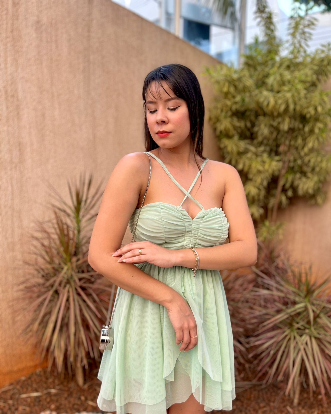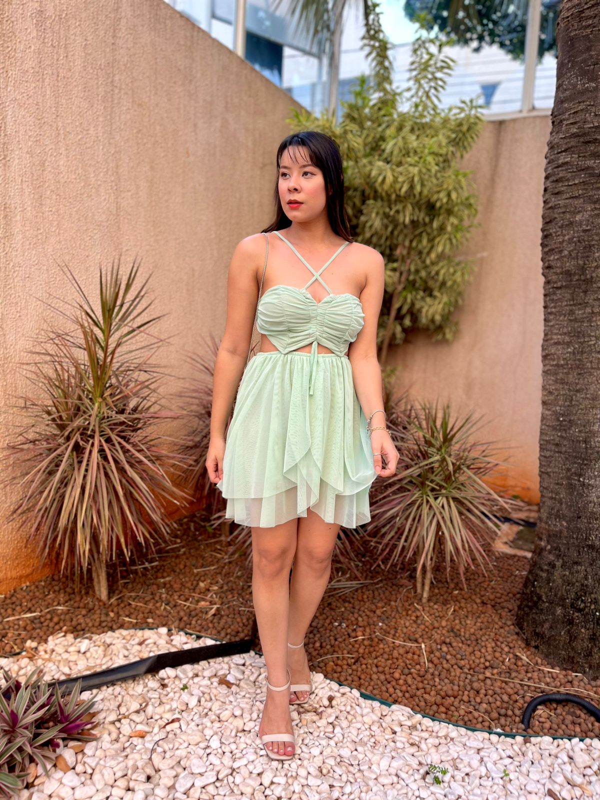 O Vestido Jade é a definição perfeita de charme e delicadeza. Confeccionado em tecido tule leve e fluido, ele possui um caimento esvoaçante que valoriza cada movimento. O decote com alças finas cruzadas adiciona um toque moderno e feminino, enquanto o recorte na cintura com elástico garante conforto e um ajuste perfeito ao corpo. 💫